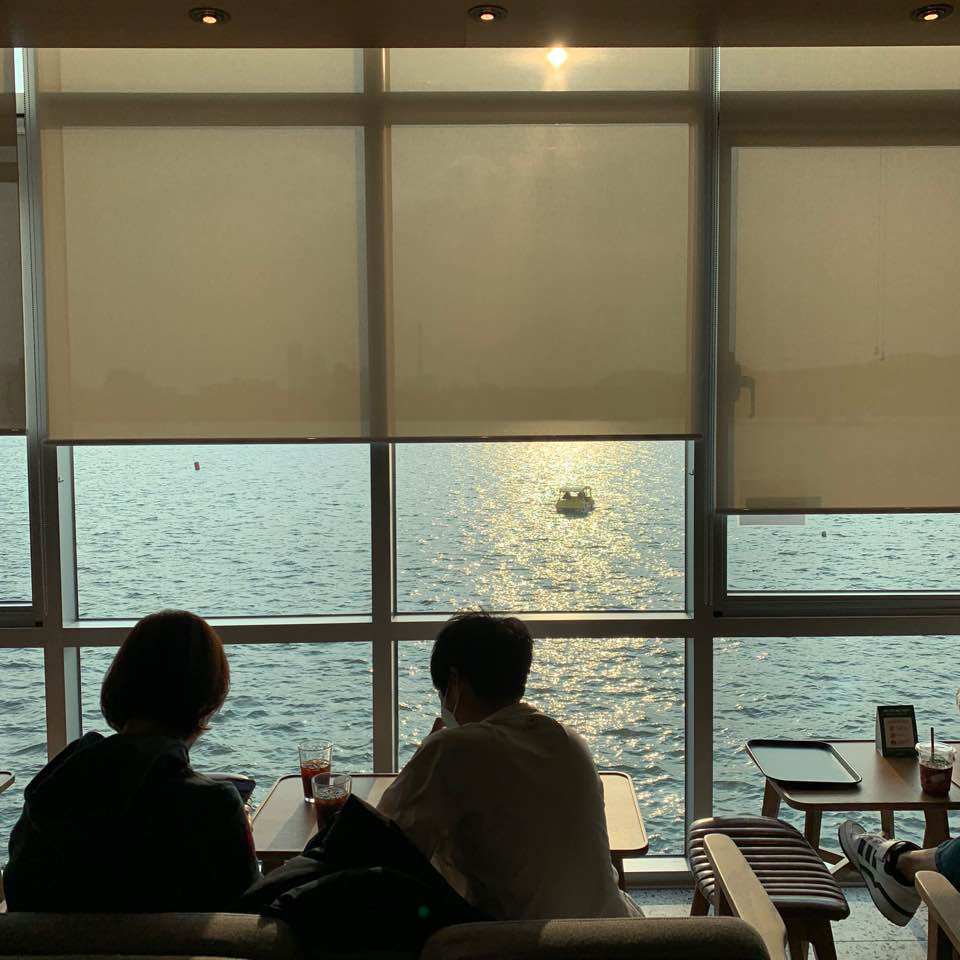 먼저 한강뷰 존에서는 이렇게 바로 앞에 아름다운 한강의 물결을 보면서 커피를 마실 수 있습니다. 제일 자리 경쟁이 치열한 곳이기도 합니다. 특히 노을질 무렵에는 이렇게 한강의 윤슬을 볼 수 있고, 노을도 감상할 수 있어서 로맨틱한 자리가 아닐까 싶어요 :)